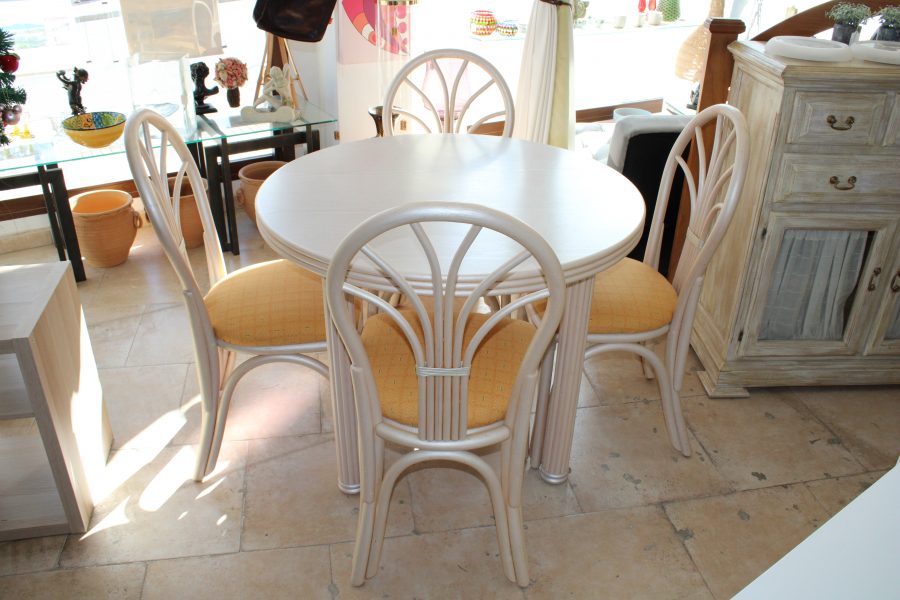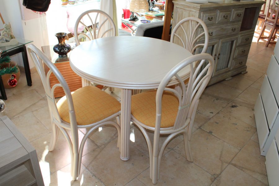 Tags: Dining set, Four Matching Bamboo Framed Cushioned Chairs, Round Wooden Table