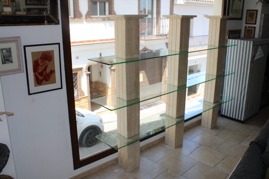 Three Tier Glass Display Unit Three Marble Pillars 280cm Long 204cm High 45cm Deep