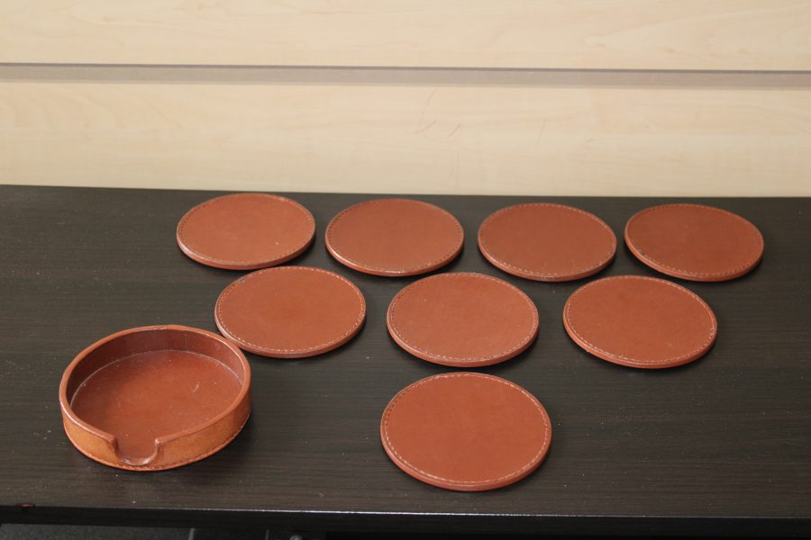 Eight Matching Leather Coasters With Holder 10cm Diameter