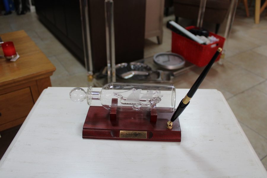 Wooden Base Glass Ship In A Bottle Pen Holder